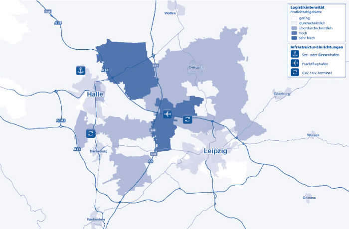As the Leipzig/Halle region with its large cargo airport acts as a European gateway and logistics hub logistics service providers in particular have agglomerated in this area. Especially companies of the automotive industry, e-commerce and retail have located there. The region is an important junction on the transregional rail network. Along the well-developed and congestion-free freeways A9 and A14 most of the logistics companies can be found. Additionally the freight village Leipzig is situated there.